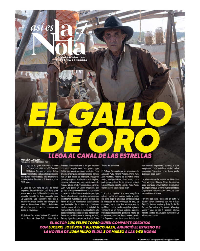 El Gallo de Oro es una serie de 20 capítulos, es un texto de Juan Rulfo, clásico de la literatura latinoamericana, a lo que tratamos con mucho respeto, hasta cierto grado porque había que hacerlo en pocos capítulos. Pero creo los encargados del departamento literario hicieron un gran trabajo de adaptación, incluyeron personajes que no existían en el texto original, pero que embonan muy bien en este marco de realidad alterna, en el universo que nos sumerge Juan Rulfo que es un México imaginario, que yo creo y estoy convencido que nunca existió como lo hacen los buenos novelistas, pero que fueron referentes muy inmediatos que podemos identificar en nuestro país. Es por eso que nos fuimos a San Luis Potosí donde todavía existen esa haciendas de la época y poblaciones rurales, donde el abandono, la soledad, la migración los ha dejado en medio del polvo y la desolación donde parece que está habitado por fantasmas, un México que sí existe y ahí está, fue muy digno de retratarse”, explicó Luis Felipe Tovar a Así es la Nota.