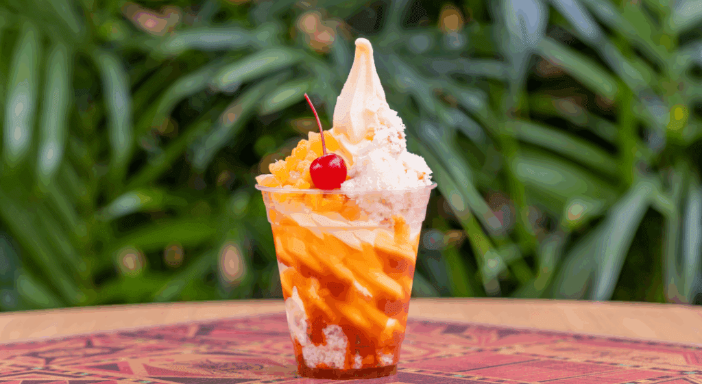 - Sundae de piña invertido de Tropical Hideaway: piña batida DOLE, chispas de caramelo y pastel de piña invertido, cubierto con una cereza al marrasquino.