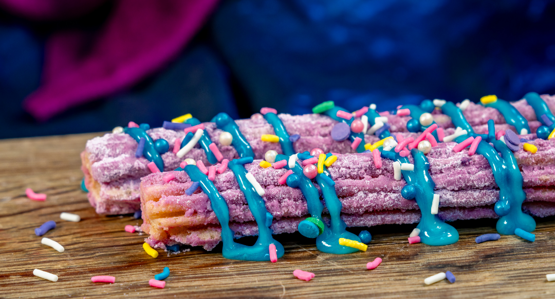 - Churro de celebración del 70.º aniversario, disponible en carritos de churros selectos: churro clásico cubierto con azúcar ube, glaseado de frambuesa azul jaspeada y chispas.