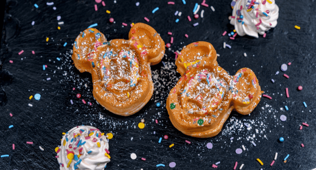 - Waffle de celebración con forma de Mickey de Schmoozies!: con crema batida de fresa, chispas y azúcar glas.