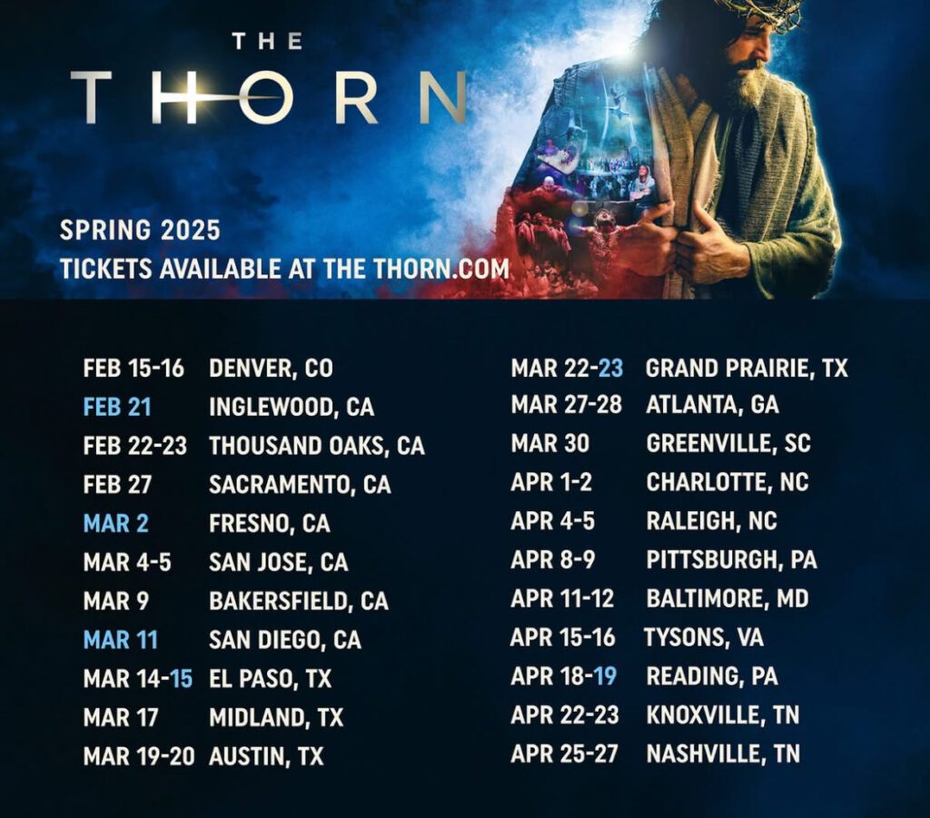 The Thorn ya pasó por Denver, Colorado y actualmente se encuentran en San José, California, después pasarán por Bakersfield, para llegar el martes 11 de marzo al Teatro Civic de San Diego. La compañía presenta algunas de sus funciones en español como San Diego, California, El Paso y Grand Prairie, Texas.